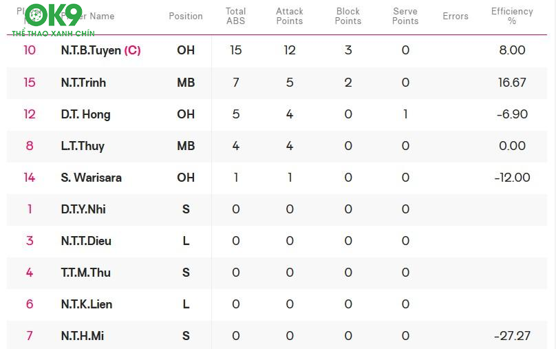 Dù thất bại, Nguyễn Thị Bích Tuyền, đội trưởng của LPB Ninh Bình, vẫn thể hiện phong độ ấn tượng. Đối mặt với hàng phòng ngự chắc chắn của đối thủ, Bích Tuyền vẫn thực hiện những cú đập mạnh mẽ, gây khó khăn cho NEC, bất chấp việc cô và đồng đội Nguyễn Thị Hoài Mi gặp một số vấn đề trong các đường chuyền. Bích Tuyền đã ghi được 15 điểm, dẫn đầu danh sách ghi điểm cho đội nhà.